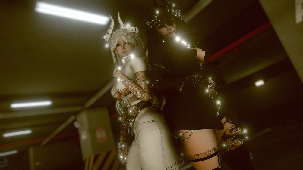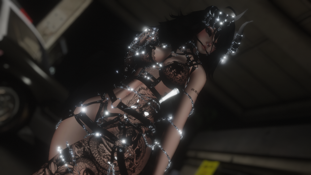 Corset/ Harness, Booty Harness, Arm Chains, Hand Chains, Chain Garter, Barbed Wire Waist Chain, Chain Horns, Mask, Gag, Body Shurikens, Nose Rings, Nip Nails, Angel Fangs Piercing, Bridge Piercing.